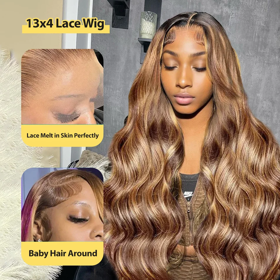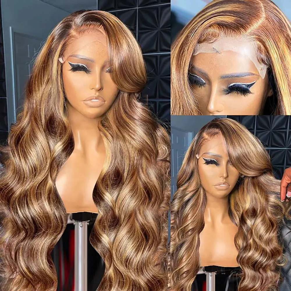 13x6 4/27 Highlight Body Wave HD Lace Frontal Wig 30 inch Curly 13x4 Transparent Lace Front Human Hair Lace Closure Wig