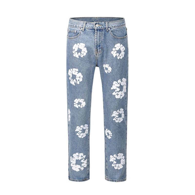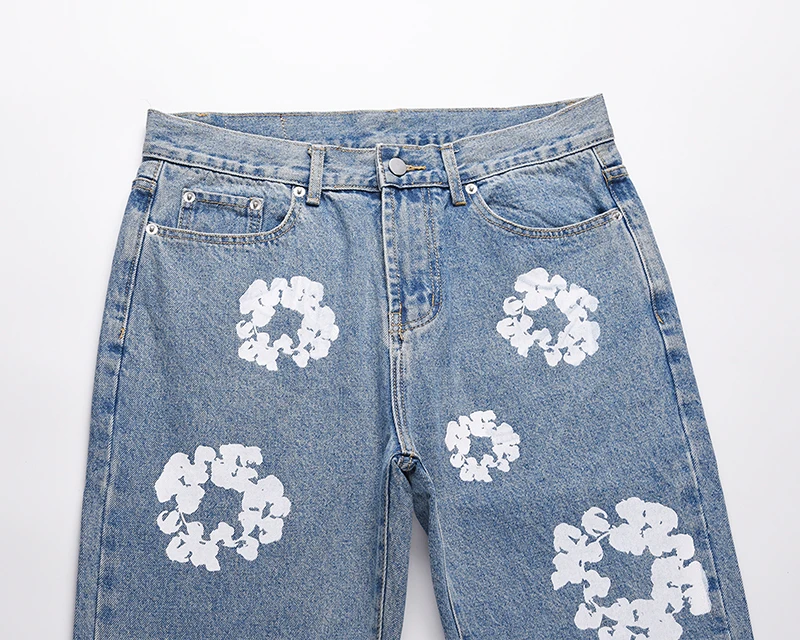 Flower print jeans Harajuku style color matching pants street fashion retro straight leg casual men's and women's denim trousers