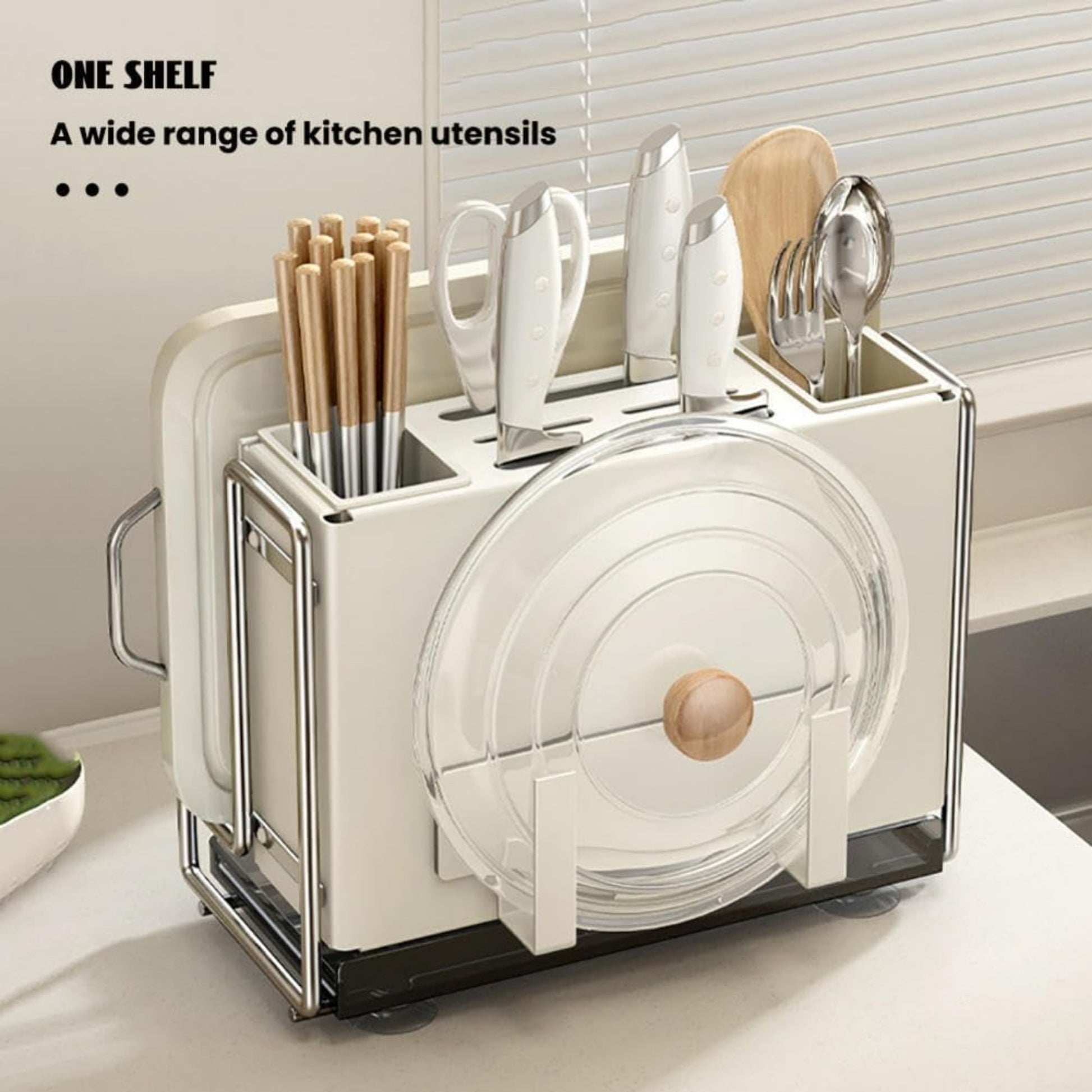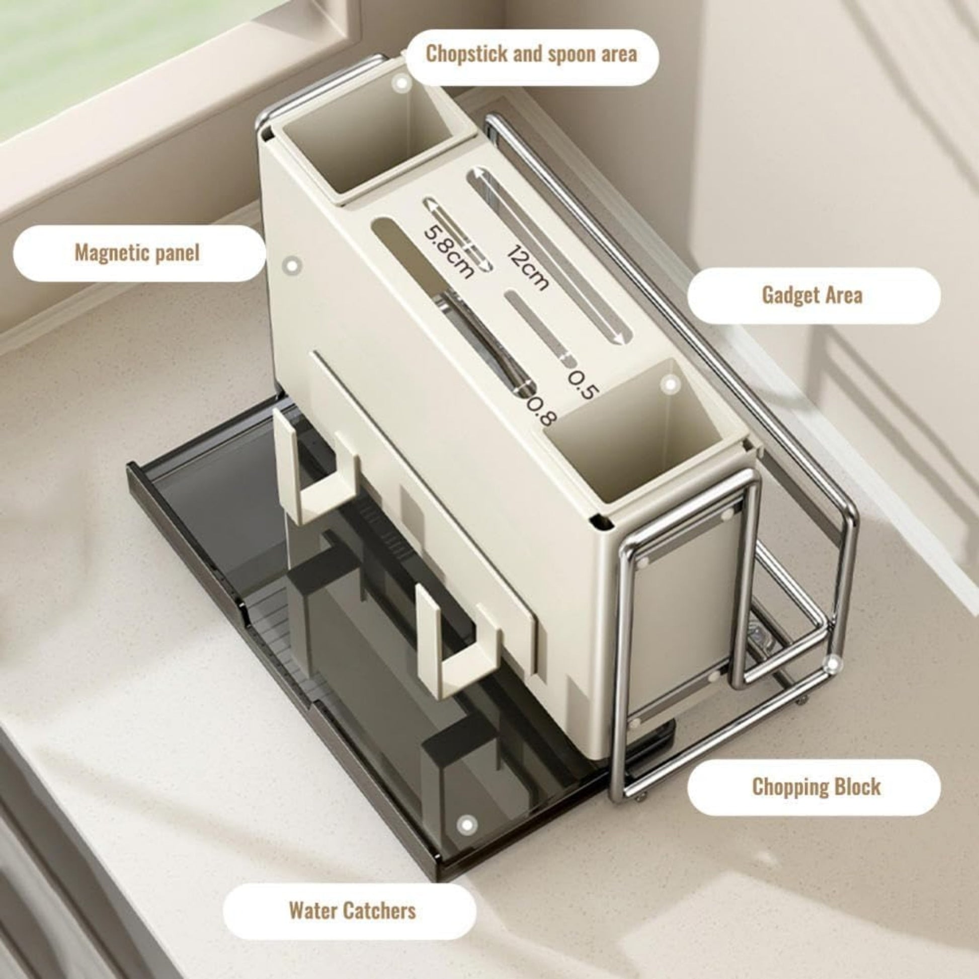 Versatile Knife Storage: This knife block holder can accommodate a wide range of knives, making it a universal choice for your kitchen. It keeps your knives organized and within easy reach. Sturdy and Stable: The well-constructed design ensures the knife rack shelf is stable and can hold your knives securely, preventing any accidents. Magnetic Chopsticks Cage: The included magnetic chopsticks cage provides a convenient place to store your chopsticks, keeping them separate and tidy. Chopping Board Storage: With space to put your chopping board, this storage rack offers a comprehensive solution for all your kitchen essentials. Elegant White Finish: The white color gives it a clean and fresh look that blends seamlessly with any kitchen decor, adding a touch of style to your countertop.