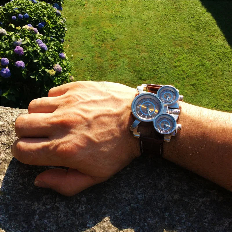 Mens Watches Oulm Top Brand Luxury Military Quartz-watch 3 Small Dials Leather Strap Male Wristwatch