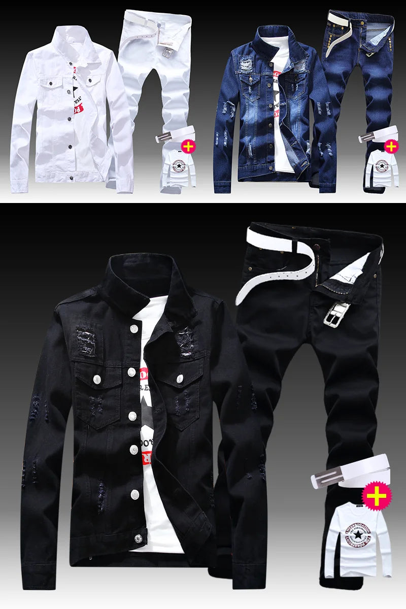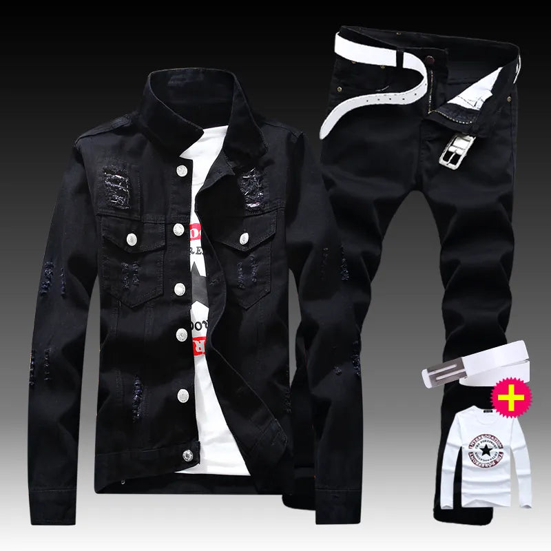 New Men's Denim Jacket Pants 2pcs Set Single Breasted Holes Casual Coat Trousers Slim Fit Cool Boys Jackets A222