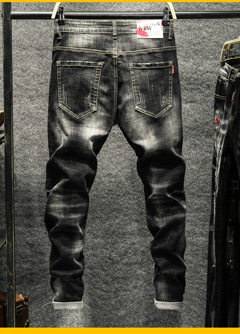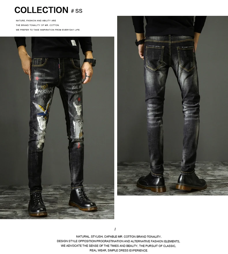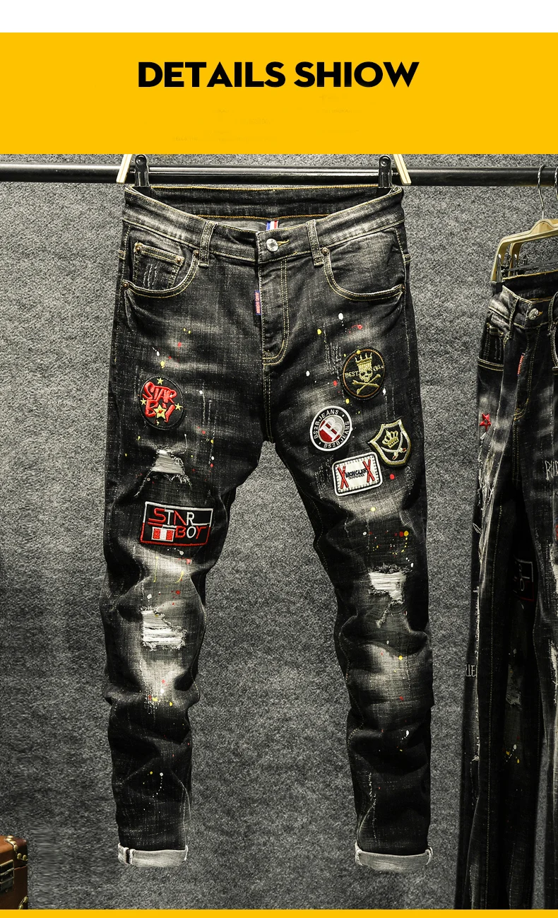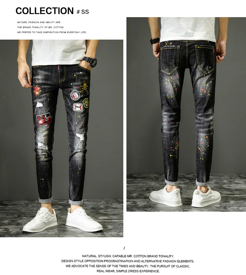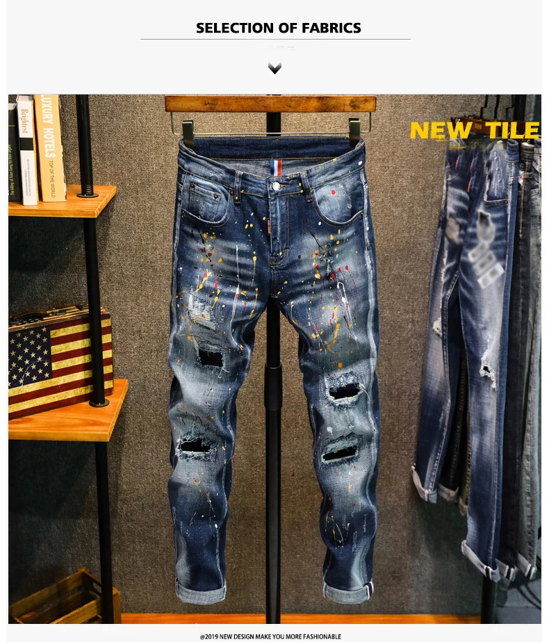 New style personality ripped jeans men's male Korean style trendy fashion paint dot splash ink design slim print pants trousers