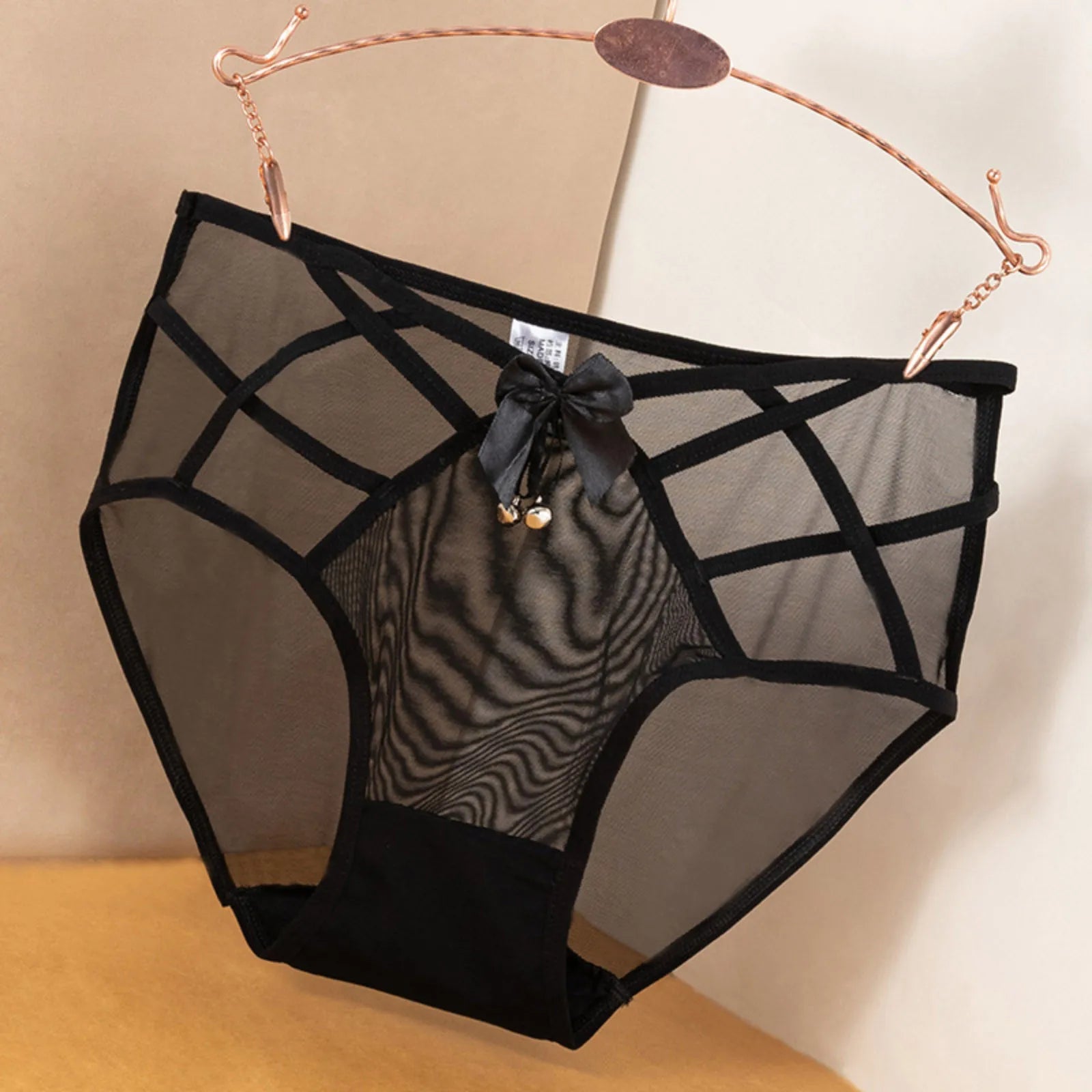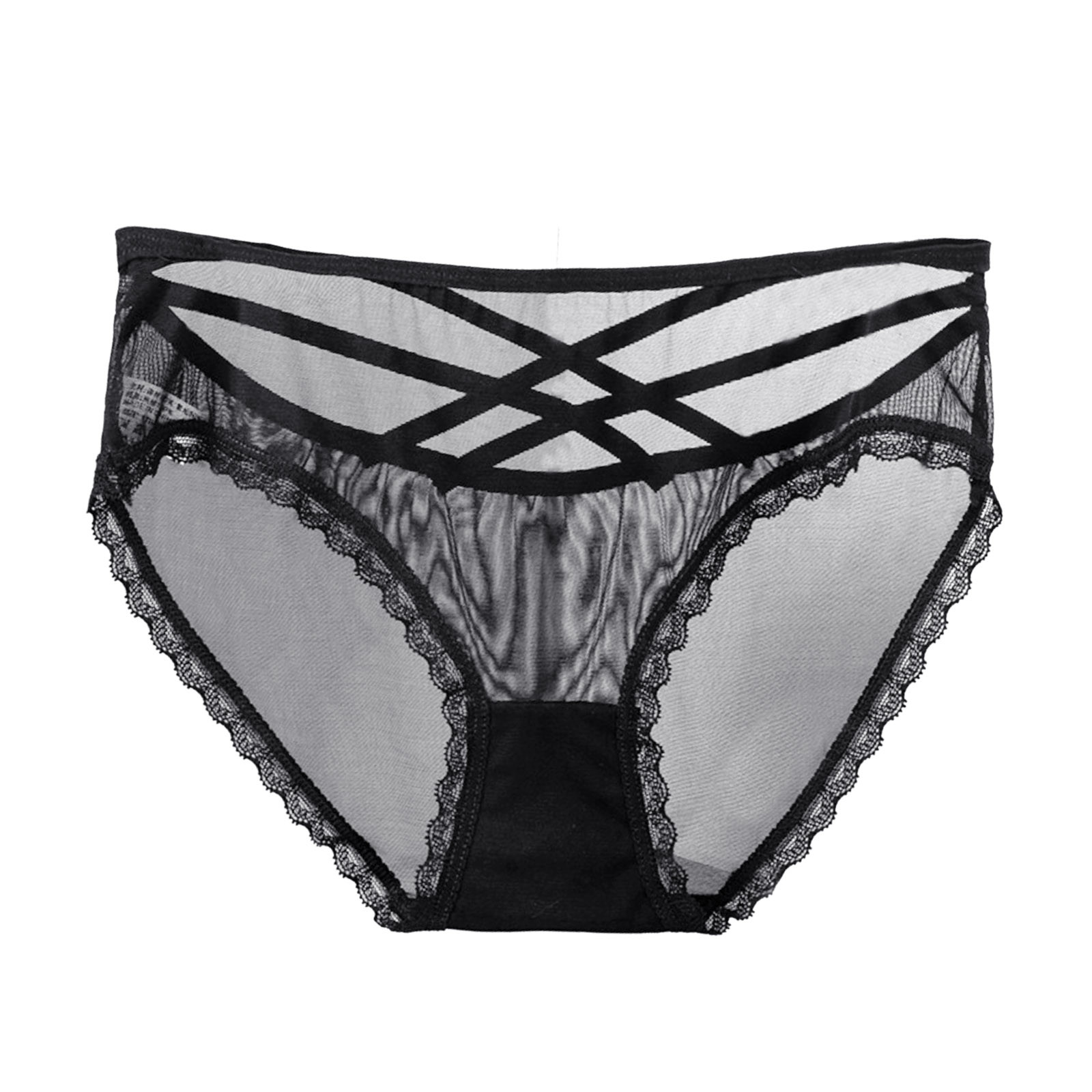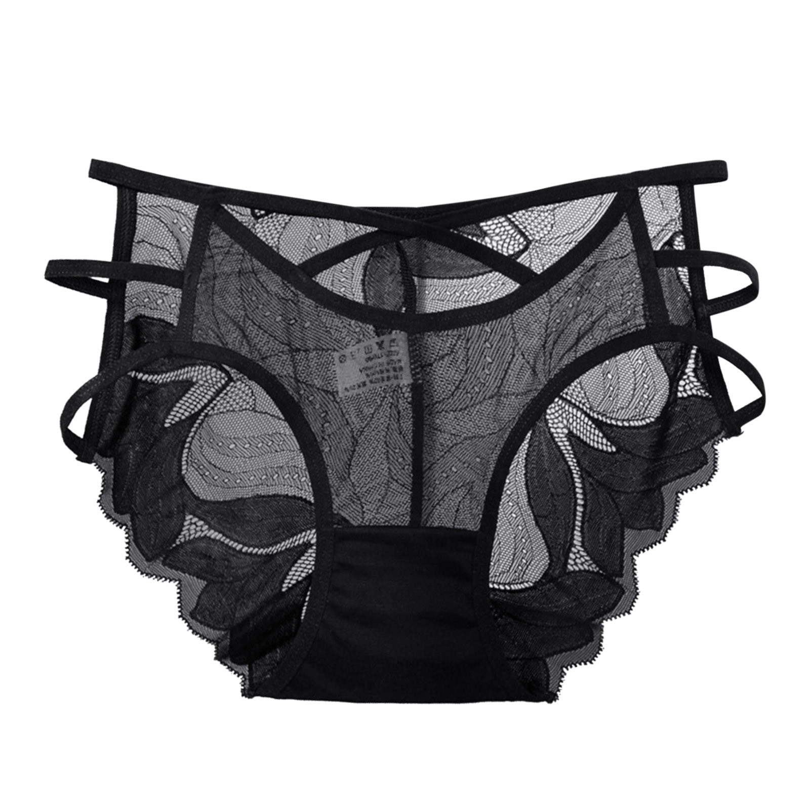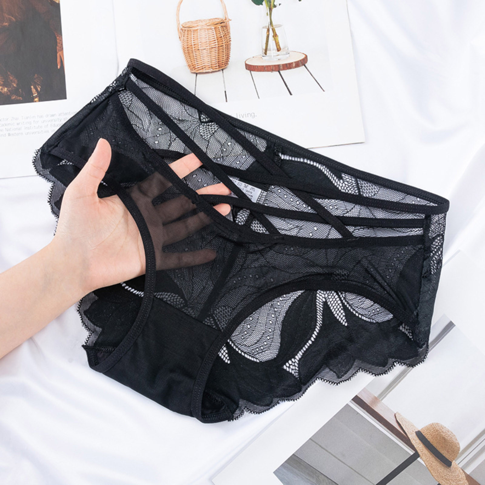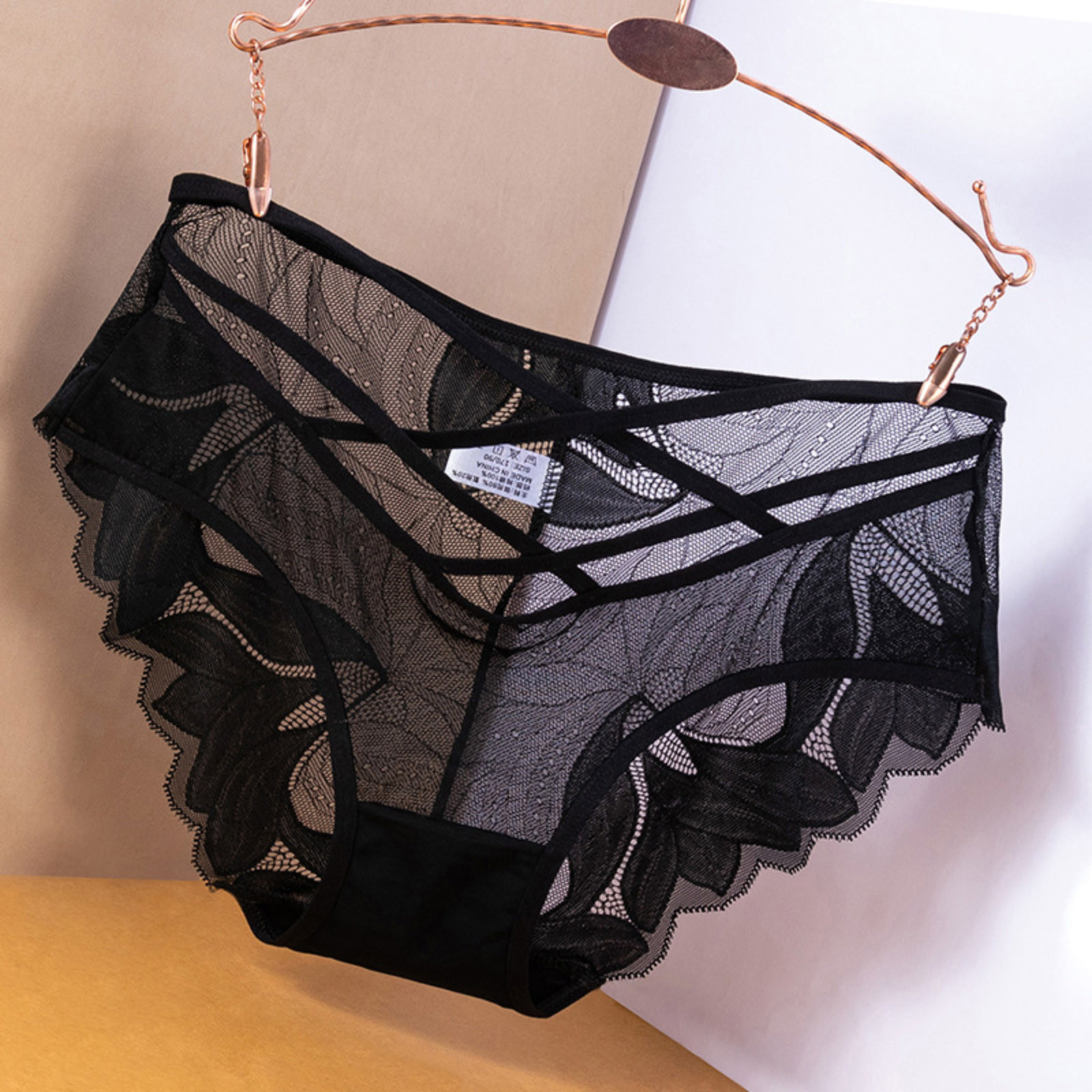 Plus Size Black Lace Hollow Out Lingerie Sexy Perspective Mid-waist Briefs Underwear Seamless Strap Breathable Panties Knicker