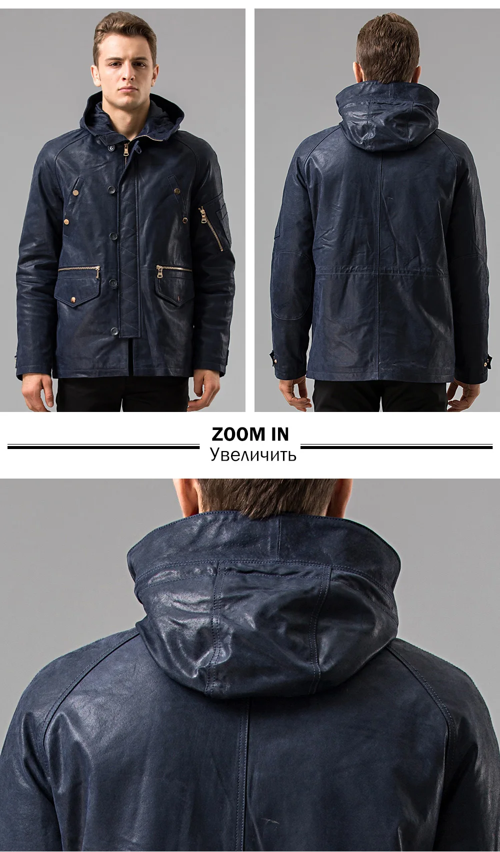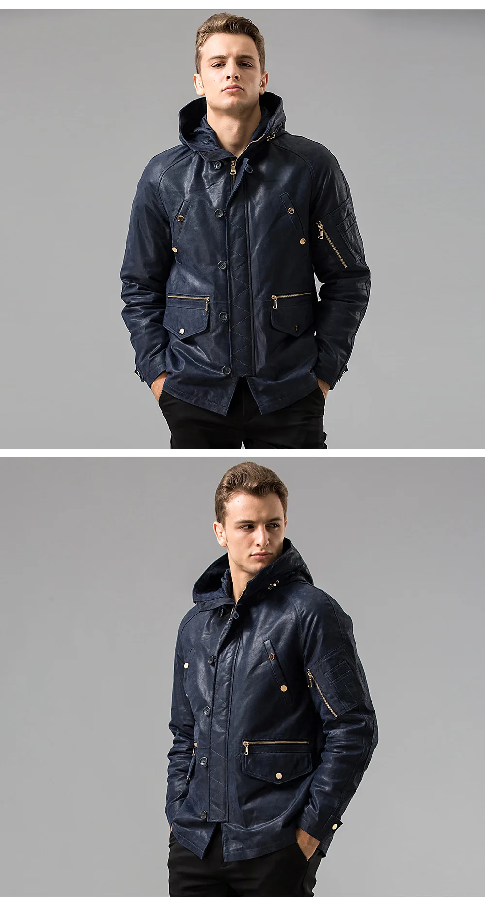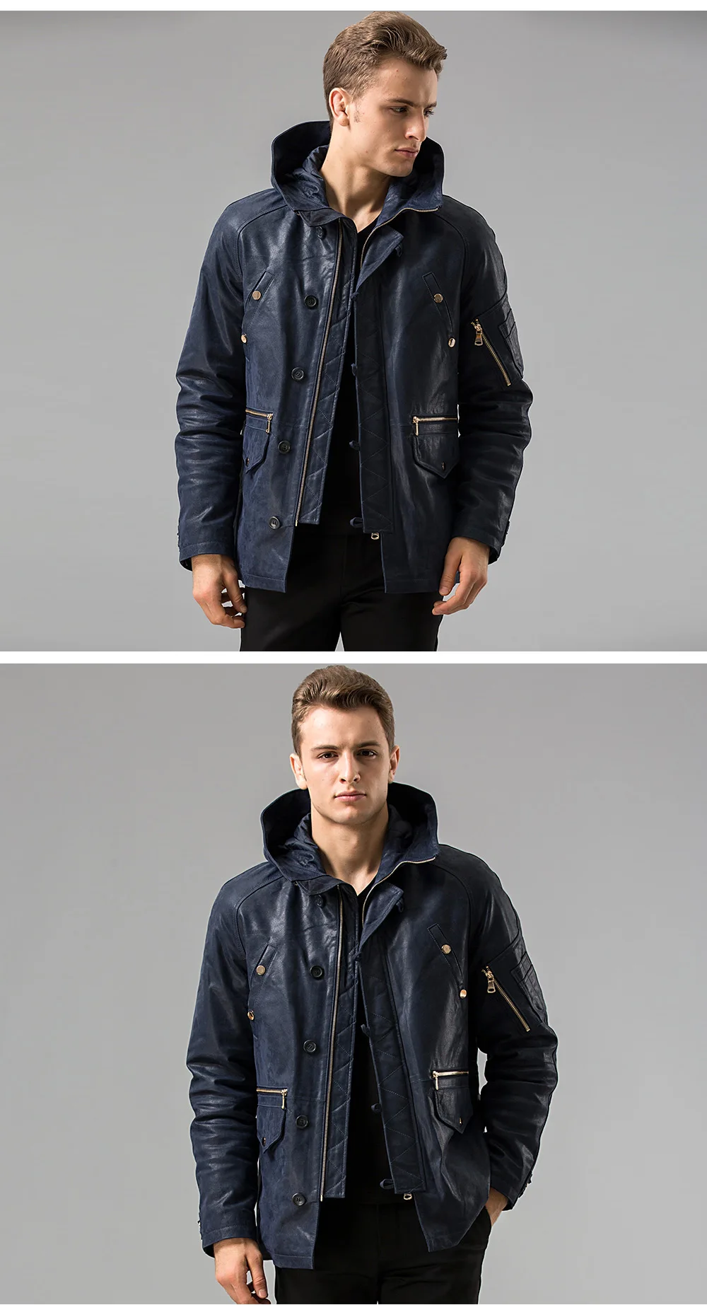 S-6XL Winter Men's Pigskin real leather jacket Hooded hat Detachable Genuine Leather jacket male overcoat