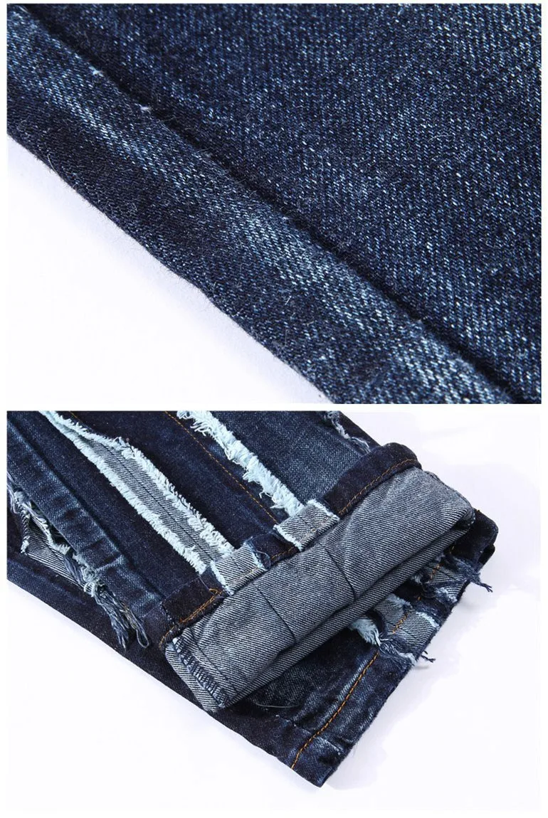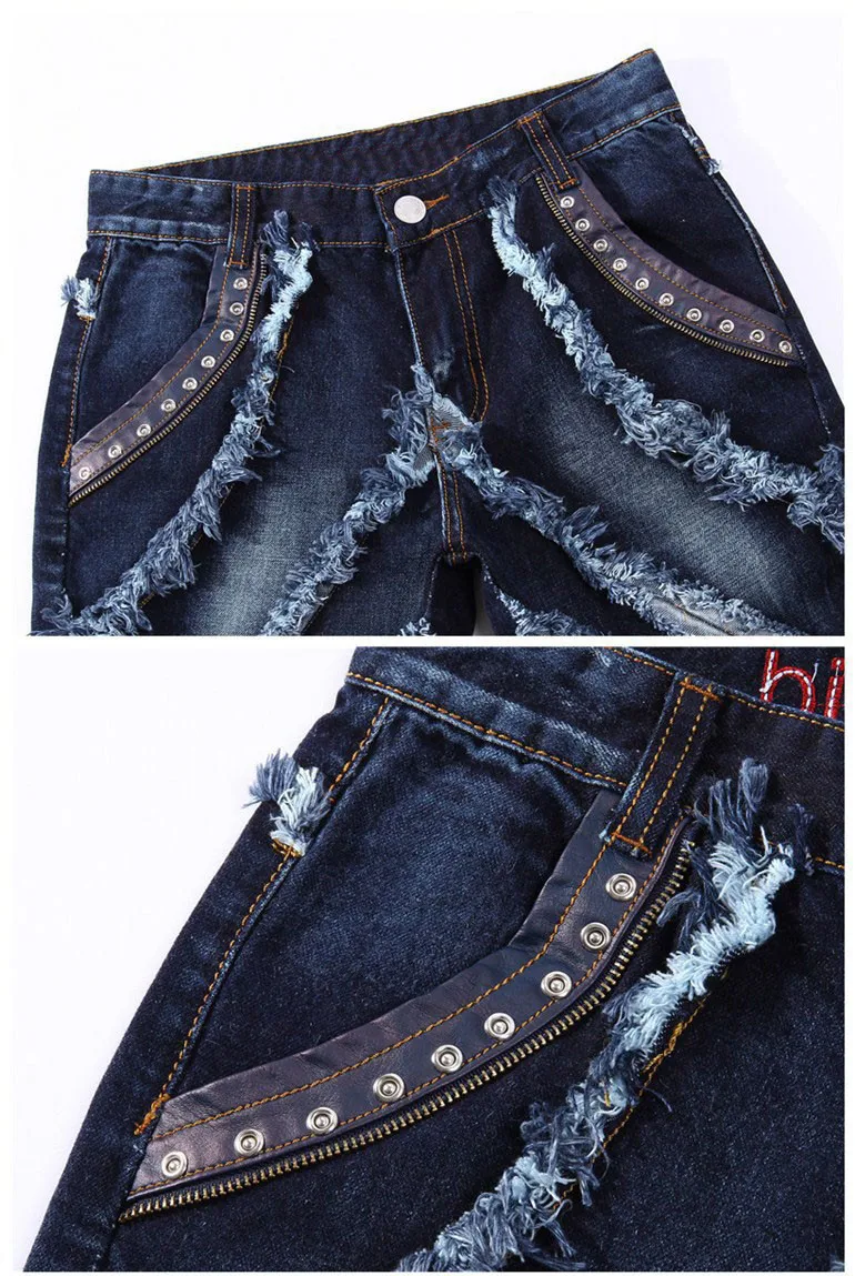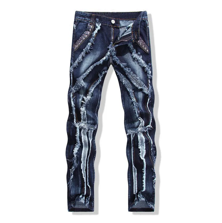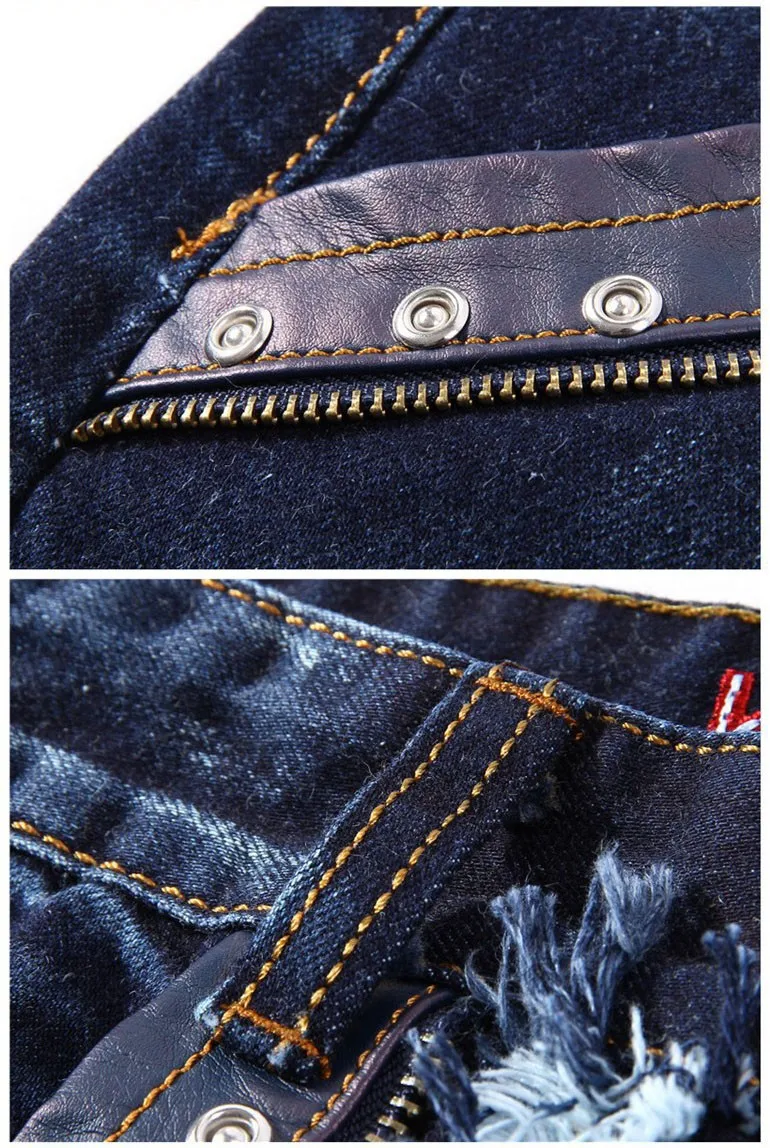 Sokotoo Men's fashion patchwork spliced ripped jeans Male personality leather rivet slim straight denim pants Free shipping